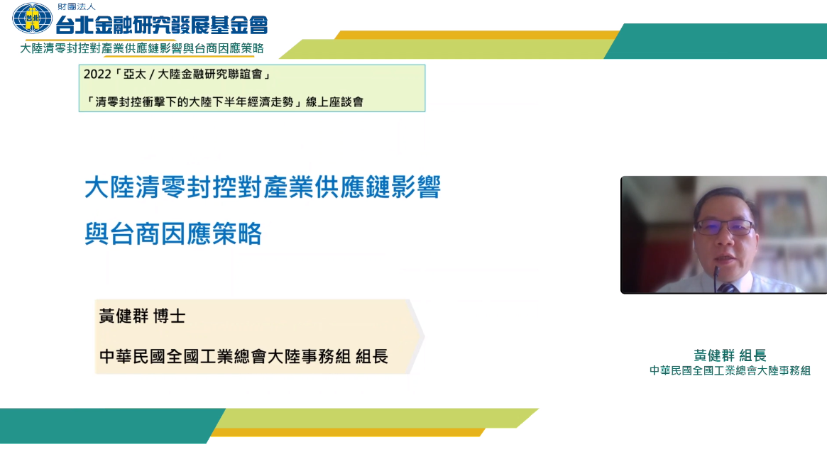 大陸自新冠疫情爆發後,始終堅持「清零」防疫方針,上海更從今年3月Omicron開始蔓延,即採取嚴格的「封城、封控」政策,從上海、昆山一路到蘇州,剛好位於電子供應鏈的重要地帶,超過161家台商上市櫃公司受影響。大陸的清零政策,也影響全球經濟,除了中國是世界製造工廠之外,同時也是世界第二大經濟體,生產及消費在全球都佔有重大地位,所以中國打噴嚏,全世界都會感冒,台灣自然也無法置身事外。而下半年更是電子業旺季,若大陸封控延長到下半年,對電子零組件產業的衝擊恐比上半年還大。面對產業發展的關鍵時刻,台商與台資金融業應如何因應,實屬我們應要關注的重要課題。