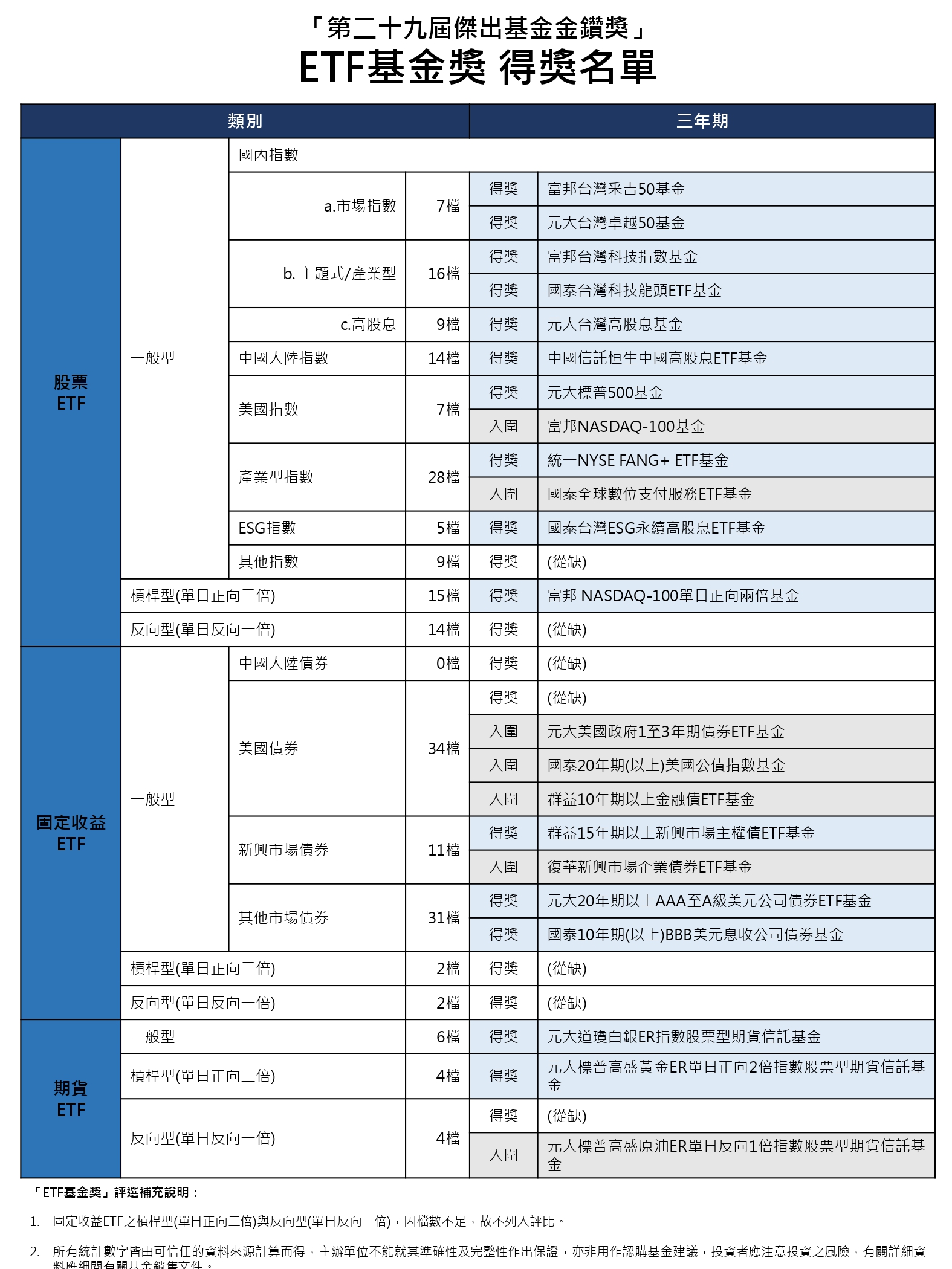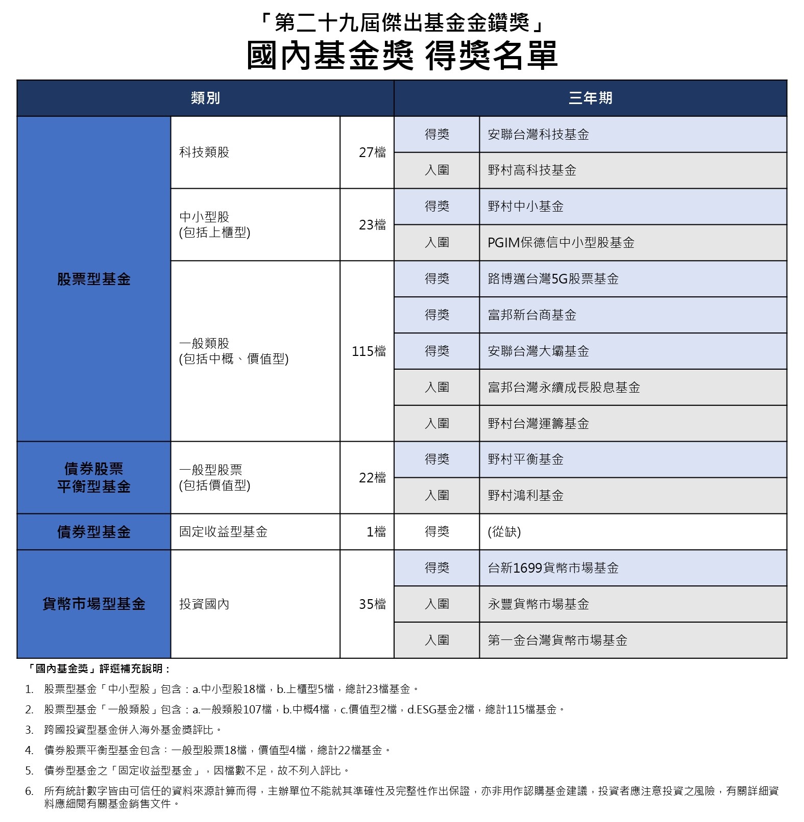 本屆符合評選標準的國內基金共有223檔、ETF基金有218檔,海外基金則有1436檔。在經過激烈的競爭下,最終「國內基金獎」總計有8家投信業者所發行的7檔基金得獎、7檔基金入圍。「ETF基金獎」共有7家投信業者所發行的15檔基金得獎、7檔基金入圍。「海外基金獎」共有11家投信/投顧業者所發行或總代理的21檔得獎。