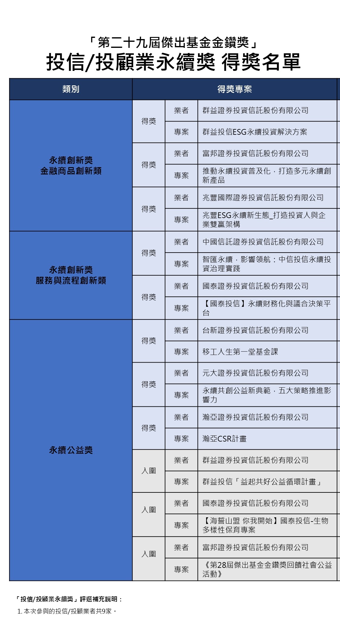 隨著全球對永續發展、環境保護和社會責任的日益重視,台灣的投資市場也逐步融入ESG(環境、社會、治理)理念,以回應投資人及市場的需求。同時自2024年起,投信事業須依資產管理規模分階段完成永續報告書之編製與申報。金鑽獎自去年第28屆增設「永續創新獎」與「永續公益獎」,今年在「永續創新獎」持續深化細分為「金融商品創新類」、「服務與流程創新類」,以期鼓勵投信投顧業者透過創新方式,提供可支持永續發展的金融解決方案,促進資金流向綠色、低碳與社會責任相關的產業,進而加速台灣邁向永續金融生態系統的發展。而「永續公益獎」則聚焦於企業在社會責任(S)領域的具體貢獻,尤其是對弱勢群體、社會公平及公益影響力的實質成效。也順應投資人對企業治理、環境友善、以及社會責任的日益重視。「投信/投顧業永續獎」合計共有9家投信業者共襄盛舉,其中「永續創新獎-服務與流程創新類」,3專案得獎;「永續創新獎-金融商品創新類」2專案得獎;「永續公益獎」則有3專案得獎、3專案入圍。