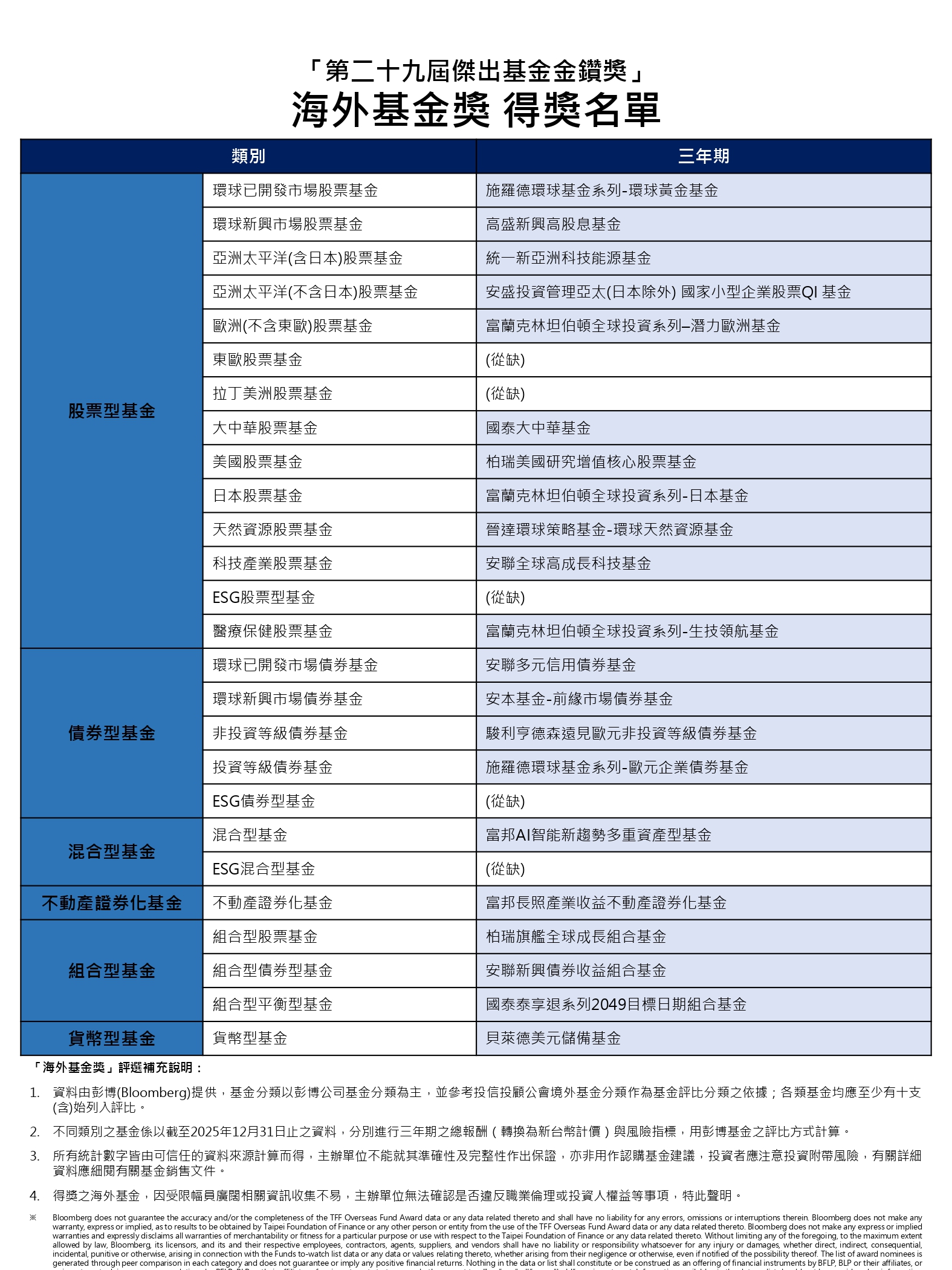由「財團法人台北金融研究發展基金會」主辦,「彭博(Bloomberg)」、「今周刊」及「非凡電視台」合辦的第「二十九屆傑出基金金鑽獎」,於2026年3月26日在台北遠東香格里拉大飯店舉行頒獎典禮公布得獎名單。作為國內基金業界最具代表性、歷史最悠久且有最高知名度的基金獎項,「金鑽獎」每年都受到業界的高度關注,同時也吸引了廣大投資者的目光。