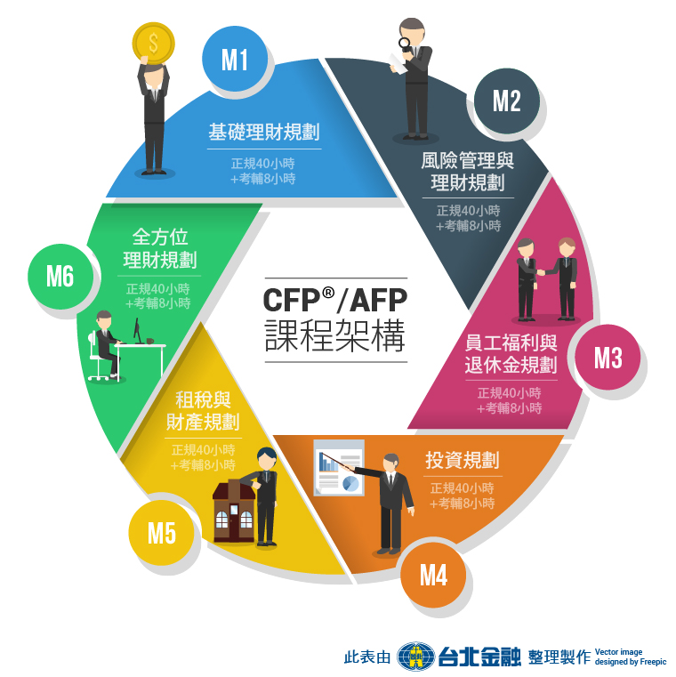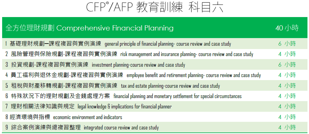 根據CFP認證教育訓練6大模組來規劃課程,建構完整學習架構。